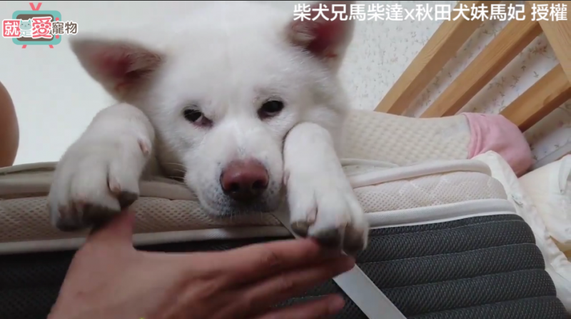 ▲秋田犬一臉生無可戀(source:影片截圖/柴犬兄馬柴達x秋田犬妹馬妃)