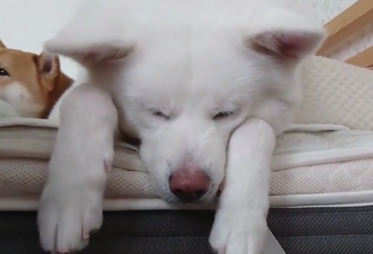 ▲馬妃睡醒發現自己被玩 超無奈。(source:影片截圖/柴犬兄馬柴達x秋田犬妹馬妃)