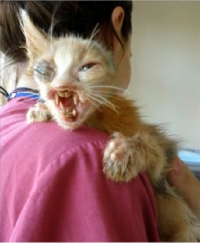 因為長年在外生活,小貓經常被比他大的野貓欺負。一隻眼睛和耳朵都受傷了
