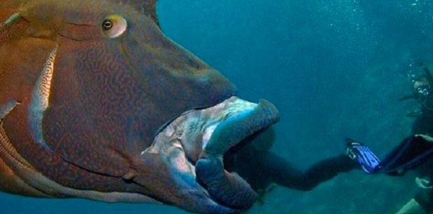 這種大魚是波紋唇魚,俗稱蘇眉魚,是世界上最大、最長壽的珊瑚魚類,通常壽命都有30年以上,雖然他們的體積大到可以把成人吞進肚子裡,不過個性非常溫和,不會主動攻擊人類,甚至允許潛水員摸摸他們,許多潛水愛好者都喜歡跟他們互動。
