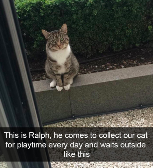 這隻喵喵叫做Ralph,每天時間一到,牠都會來家裡接我家的喵一起出去約會,有夠會放閃!