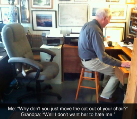 「阿公~為什麼你不把貓咪從椅子上移起來?」阿公表示:「因為我怕貓咪討厭我」