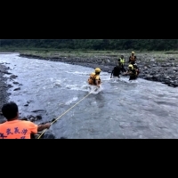 消防隊獲報有民眾受困河床,立刻出動救援,但水勢又急又猛,人根本過不去,只好架繩索渡河。