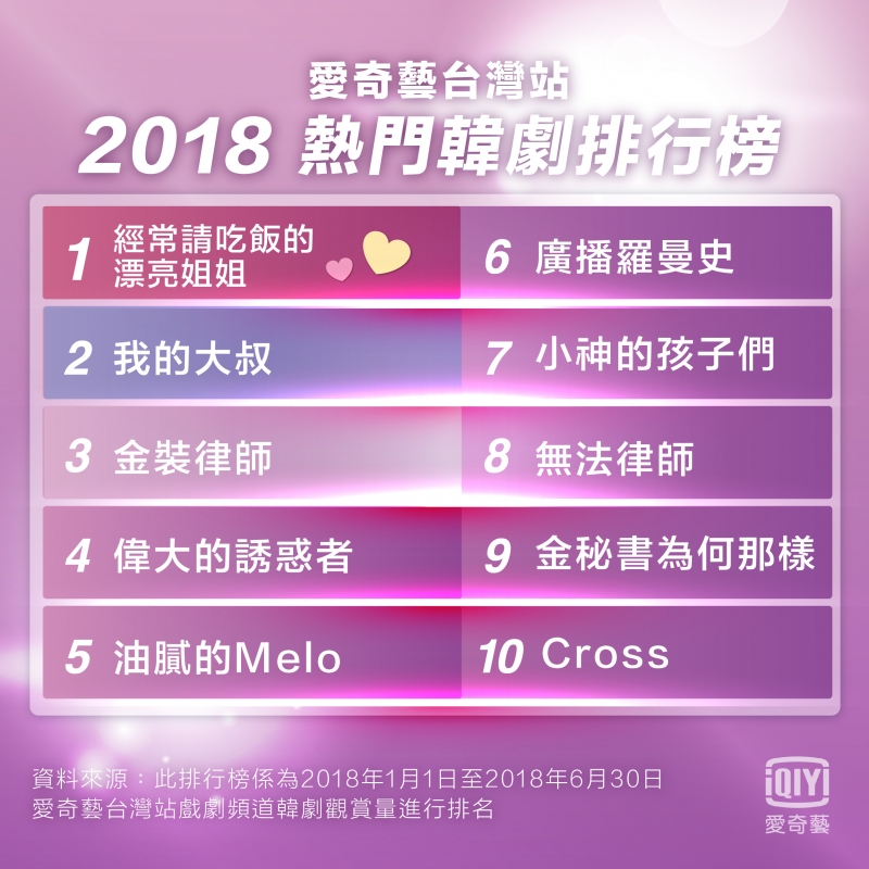 愛奇藝台灣站2018上半年十大熱門韓劇排行榜,仍以「愛情」主題為大宗,如:《經常請吃飯的漂亮姐姐》、《油膩的Melo》、《廣播羅曼史》及熱播中的《金秘書為何那樣》。其中話題最熱、最吸睛的就是《經常請吃飯的漂亮姐姐》,歷經年初的劇荒潮,一開播便引起熱烈討論,靈感來自「宋宋CP」的戀愛故事,找來35歲的孫藝珍與相隔五歲的丁海寅攜手合作,兩人不僅在劇中狂撒糖,戲外也互動頻傳,成功打造出甜蜜浪漫的戀人氛圍,讓粉絲羨慕又忌妒,加上貼近生活的劇情,以及細膩描繪女性在職場上的心路歷程,加深觀眾的共感。