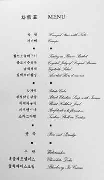 菜單上有奶油麵包、花椒炸雞、香酥八寶鴨、胡椒烤牛肉、冰淇淋等十九道料理。一名北韓人士說:「這場晚宴的料理比往年都來得豐富又豪華。」雖說美國當時正派遣航空母艦前往朝鮮半島途中,勞動黨幹部們的胃口還真是不錯。