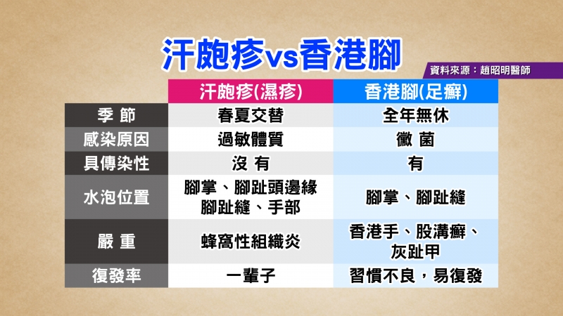 皮膚科趙昭明醫師表示,夏天汗皰疹病患比平常增加二成,汗皰疹是慢性濕疹急性發作,早期原以為是汗腺發炎造成,後來才發現錯怪汗腺,和泡疹、汗腺都無關,與個人體質對溫差的適應程度有關,好發於季節交替溫差大時,尤其當人的適應度減弱,容易覺得疲憊、長期失眠、感冒等時易發作。