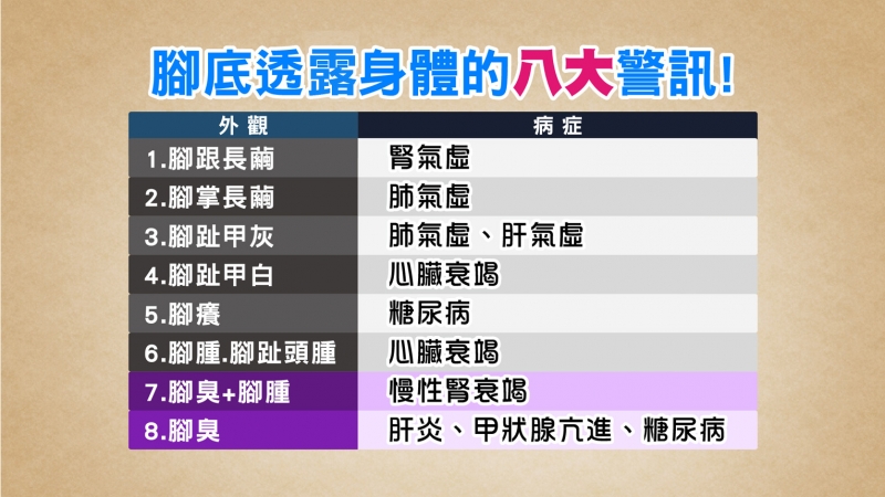 「養生先養腳」,中醫師杜丞蕓指出,腳跟長繭,有可能是腎不好;腳掌長繭則是肺不好。腳趾甲呈灰色以及很多紋路,看起來不光滑,且一節一節,都是肺氣虛及肝氣虛。