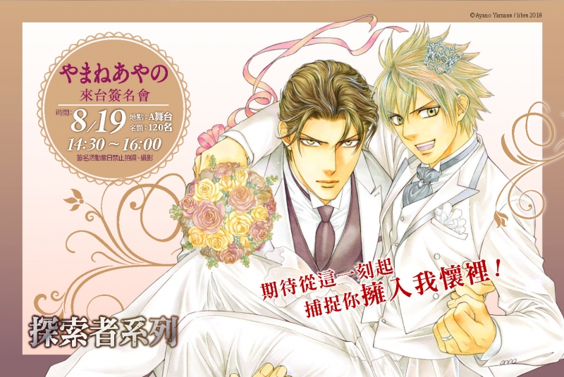 2018漫畫博覽會,台灣東販特邀耽美界超人氣大手やまねあやの(山根綾乃)老師來台舉辦個人海外簽名會,而今夏為了避免讀者們向隅,やまねあやの(山根綾乃)老師的簽名會活動將舉辦兩場並分為漫博場及安利美特場,同時也將分別推出限量120組及60組簽名資格套組,其中包含了雙開資料夾、心型胸章、壓克力吊飾、票卡夾、面紙套零錢包、環保杯套、透明海報……等簽名活動限定商品。