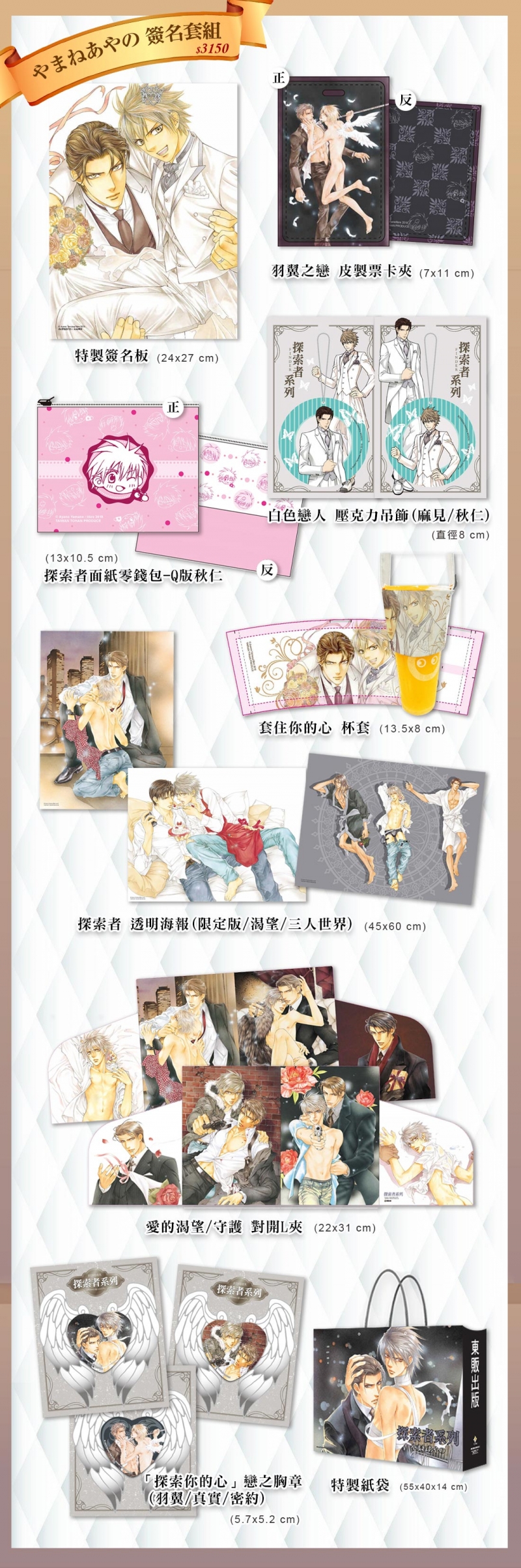 《愛的渴望&愛的守護》雙開資料夾/ 「探索你的心」戀之胸章(羽翼&真實&密約) / 白色戀人壓克力吊飾(麻見&秋仁) / 羽翼之戀皮制票卡夾 / Q版秋仁探索者面紙零錢包 / 套住你的心杯套 / 探索者透明海報(限定版&渴望&三人世界) / やまねあやの(山根綾乃)老師簽名活動專屬紙袋 / やまねあやの(山根綾乃)老師簽名活動專屬簽名板