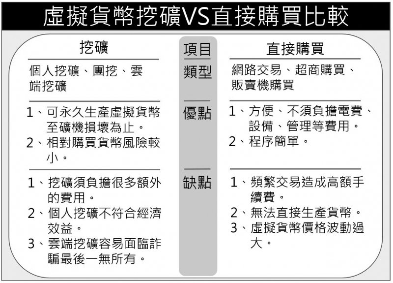 想靠挖礦賺虛擬貨幣,要考量幾個因素:首先就是設備費用,業餘的 玩家一般都是買中高階顯示卡,DIY一台挖礦機,但如果手頭資金餘裕, 就會去找特定廠商購買專為挖礦用的「礦機」;其次,挖礦通常要24小 時開著主機,因此電費、網路費,甚至是擺放礦機的場地費也要列入成本。