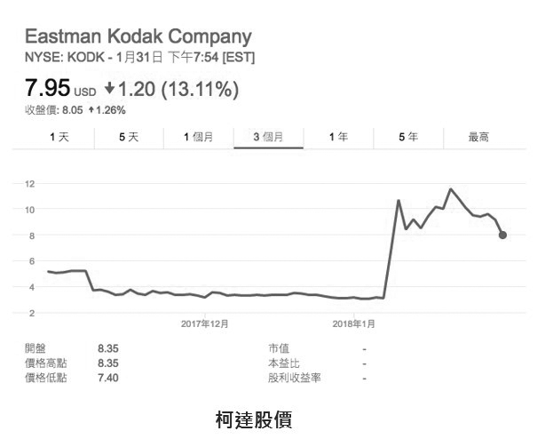 老牌攝影公司柯達(Kodak)因錯估數位相機的趨勢,歷經了五年股 價低靡下滑,卻在柯達宣布將推出自家虛擬貨幣KodakCoin,應用區塊 鏈技術來改善照片財產權的管理後,股價應聲上揚,儘管大家還不知道技 術細節上究竟是怎麼運作,彷彿只要冠上區塊鏈這三個字,公司的價值就 會提升了許多,我們來看看柯達公司冠上區塊鏈之後發生了什麼樣的變 化,柯達的股價漲了超過200%。