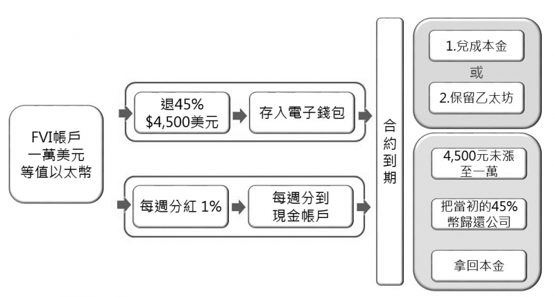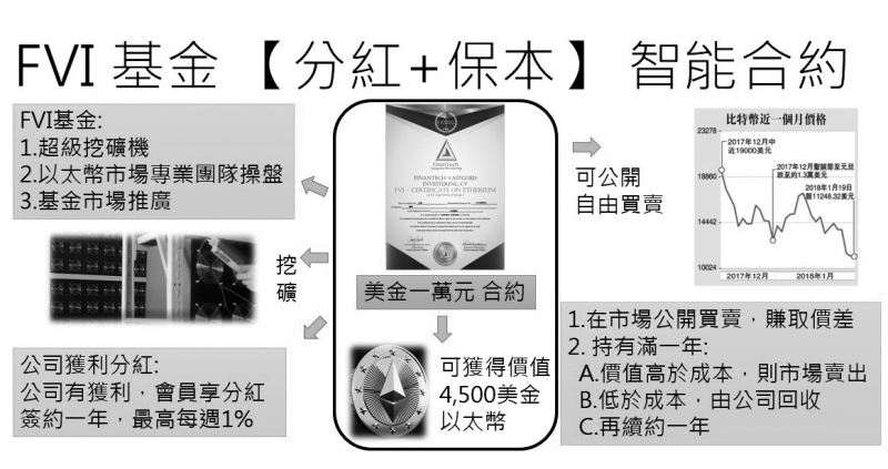 FVI 是一家基金+智能合約的投資公司,公司所有的合約都採智能 合約的方式,例如,FVI推出一個以以太坊為投資標的物的保本合約, 也就是說你投資一萬美元等值的以太幣,公司會先立馬返還你45%的 以太幣也就是4,500美元,FVI每一週還會有1%的分紅也就是100美 金的分紅,合約為期一年也就是說你會有52%的分紅,一年約可以拿 到5,200美金的利息,一開始返還4,500美元的台幣,如果漲幅超過一 萬美元,超過的部分也都算是你的淨利潤,去年以太幣漲幅約40倍,今年如果可以漲個三倍的話也就是說4,500美元漲到13,500美元,(13,500+5,200)-10,000=8,700 美元(約台幣 $261,000 元),這種 懶人投資法很適合對區塊鏈、虛擬貨幣沒心力研究的一般民眾。