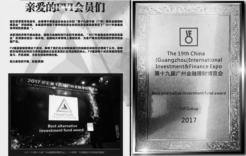FVI公司獲得2017年IFE第19屆廣州金融理財博覽會,頒發為「最佳非傳統投資基金」的殊榮,如果它是一間詐騙的公司如何能獲得此項殊 榮,我覺得是不太可能的,畢竟是由中國政府所頒發的。