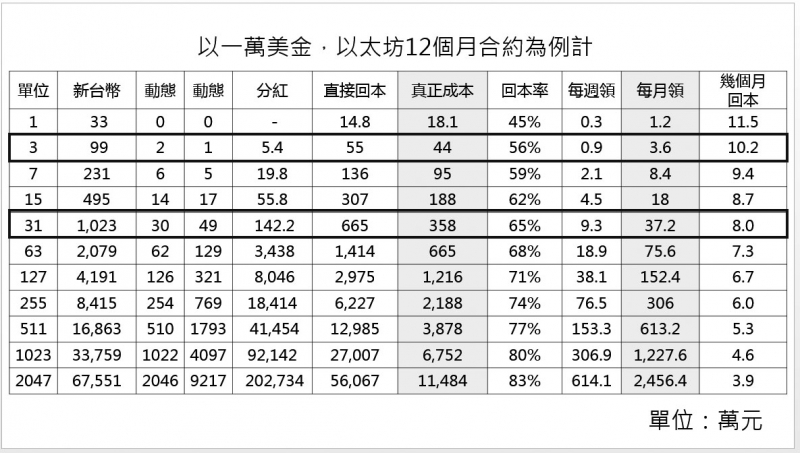 我們如果用FVI以太坊的合約用購買房地產的方式來比較,我們就 可以知道其中 FVI以太坊合約的暴利模式,例如我們用一萬元以太坊12個月合約,每週分紅100美元的條件下,如果我們在台灣購買一百萬的 套房出租的話,行情價大約可以出租5千元左右,但是如果把相同的錢 放到以太坊合約裡情況就完全不同了,可以看到上圖的三個單位需要新台 幣99萬元,智能合約約定會返還50%,加上還有動態的獎金可以領, 所以真正投入的金額只需要44萬,但是這個44萬卻可以每個月讓你領 3.6萬元。我們再看如果將價值一千萬的房子出租的話,在台灣的租屋行情價大約可以收每月2萬元租金。那如果我將這一千萬放到以太坊合約的話獲利就完全不同了。如果我購買1,023萬的合約,真正投入的成本 只需要358萬元,每個月個月租金卻可以收到37.2萬元,這樣的回報率 就稱得上是暴利了,台灣人投資是從上往下慢慢增加,在中國則是由下往 上看,意思是說大陸人投資都是從幾千萬美金看起啊!