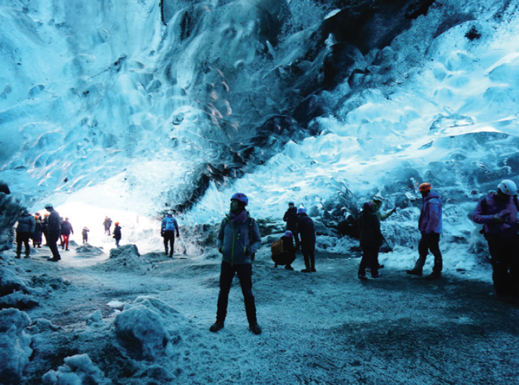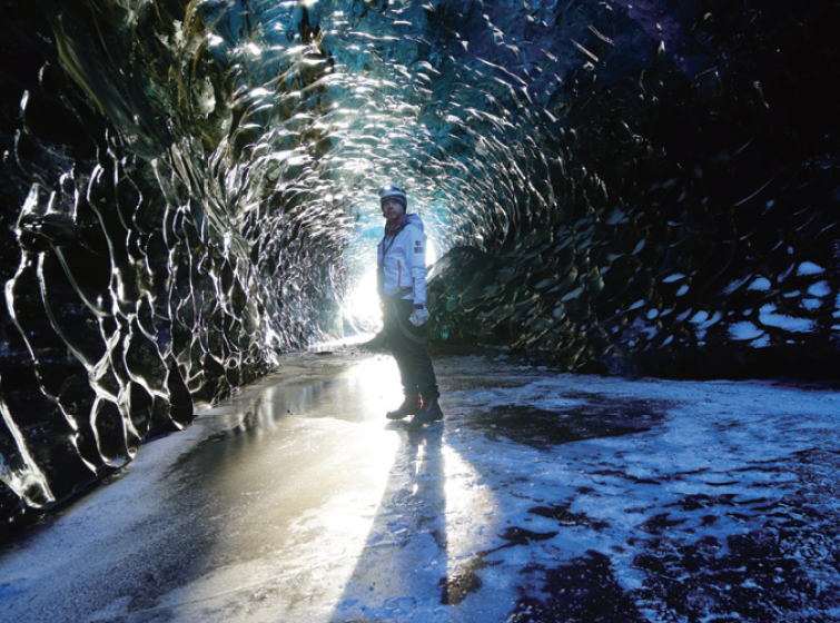從傑古沙龍冰河湖出發,約30 分鐘就可以抵達瓦特納冰原前端的冰洞,這個冰洞距離下車地點十分近,穿上簡易冰爪、徒步5 分鐘後就可以進入洞中。當進入冰洞,看到眼前的奇景時真的會不由得自主地叫了一聲「哇!」當天的好天氣讓冰洞更加湛藍,看起來真的和網路上所看到的「藍冰洞」美景一模一樣,每個進入冰洞的遊客都興奮得手舞足蹈,拿著相機猛拍。比較可惜的是洞內的遊客很多,實在找不到空檔拍空景。