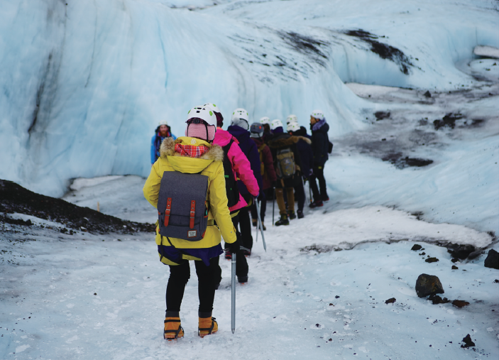 冰川健行四季都可以參加,不過要注意的是冰川健行是直接走在冰川上、有一定的危險性,因此有年齡限制(10 ∼ 15 歲,每個團不一),不適合帶著小孩進行親子旅遊。健行地點主要有兩個:一個是冰島中南部的索爾黑馬冰川Sólheimajökull,另一個則是冰島東南部、冰島最大的瓦特納冰原。其中以瓦特納冰原人氣較旺,是大多數人選擇進行冰川健行的地點。