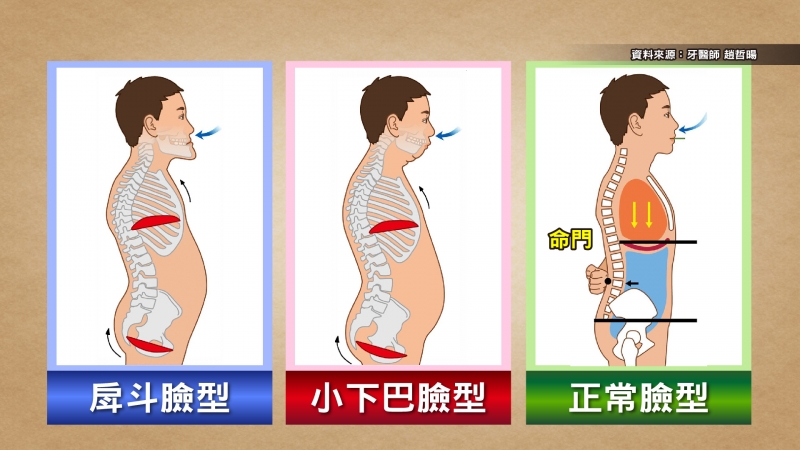 小下巴則是相反,上顎往前過度生長、下顎骨發育不理想,鼻子不好,也容易有打鼾症狀。平常講捲舌音容易嘟嘴,舌根力量不夠,需要靠臉部肌肉幫忙吞嚥口水,容易胃酸逆流,且腰椎過度彎曲,通常會肚子隆起有小腹,腹內壓不足,橫隔膜鬆弛,造成逆流更嚴重,容易胃腸不適。