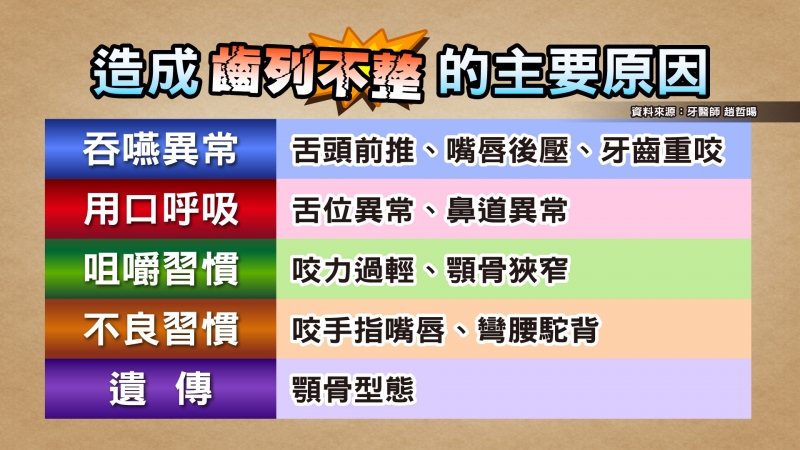 齒列不整有很多種,最常為人所知的是戽斗和小下巴(暴牙)二種,牙醫師趙哲暘表示,一般人俗稱的戽斗是下巴大、牙齒反咬(又稱地包天),特色是上顎骨頭小、下顎骨頭大。戽斗的人常聳肩,胸椎會壓迫脊神經,因而影響心臟功能,前總統李登輝就是一個很有名的案例。