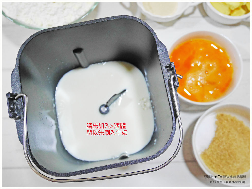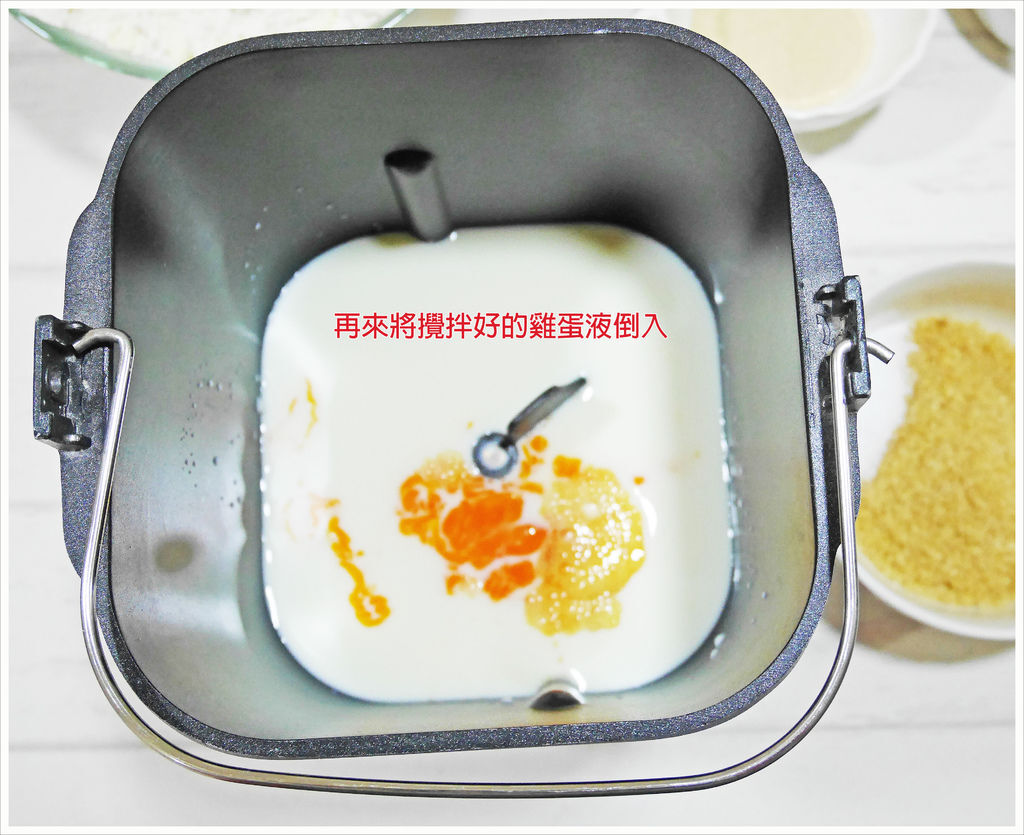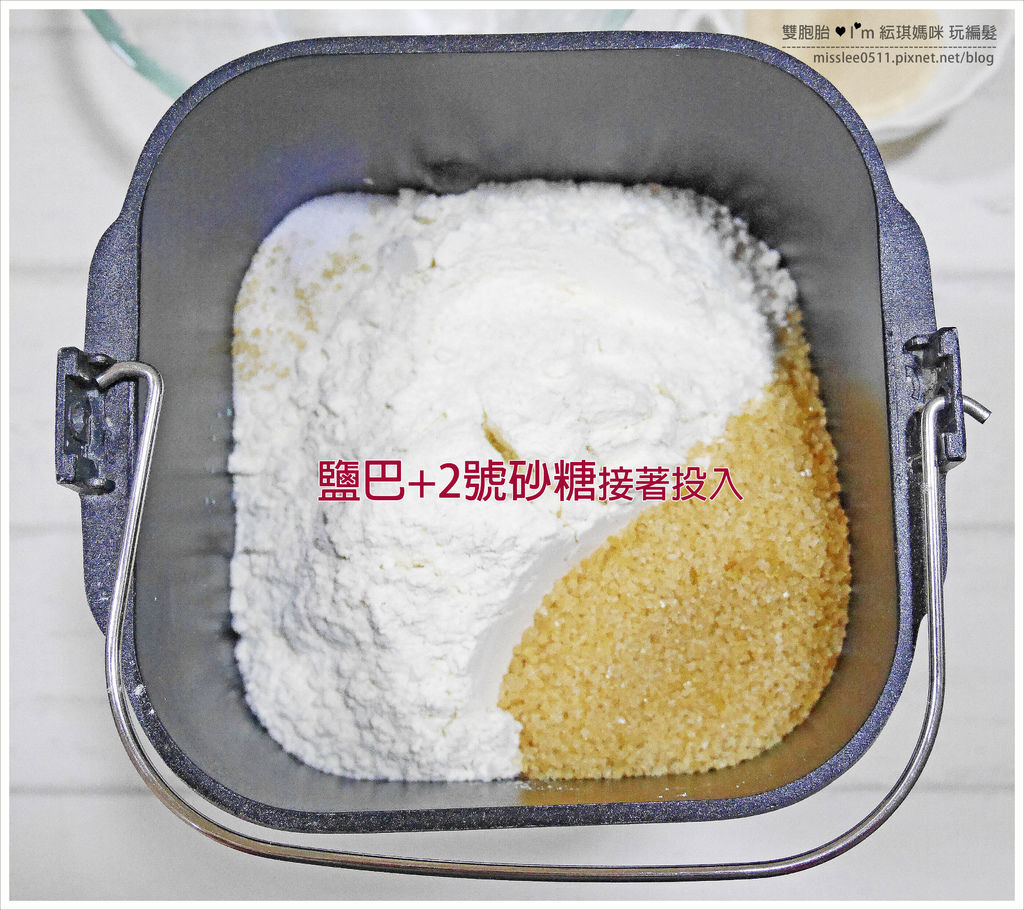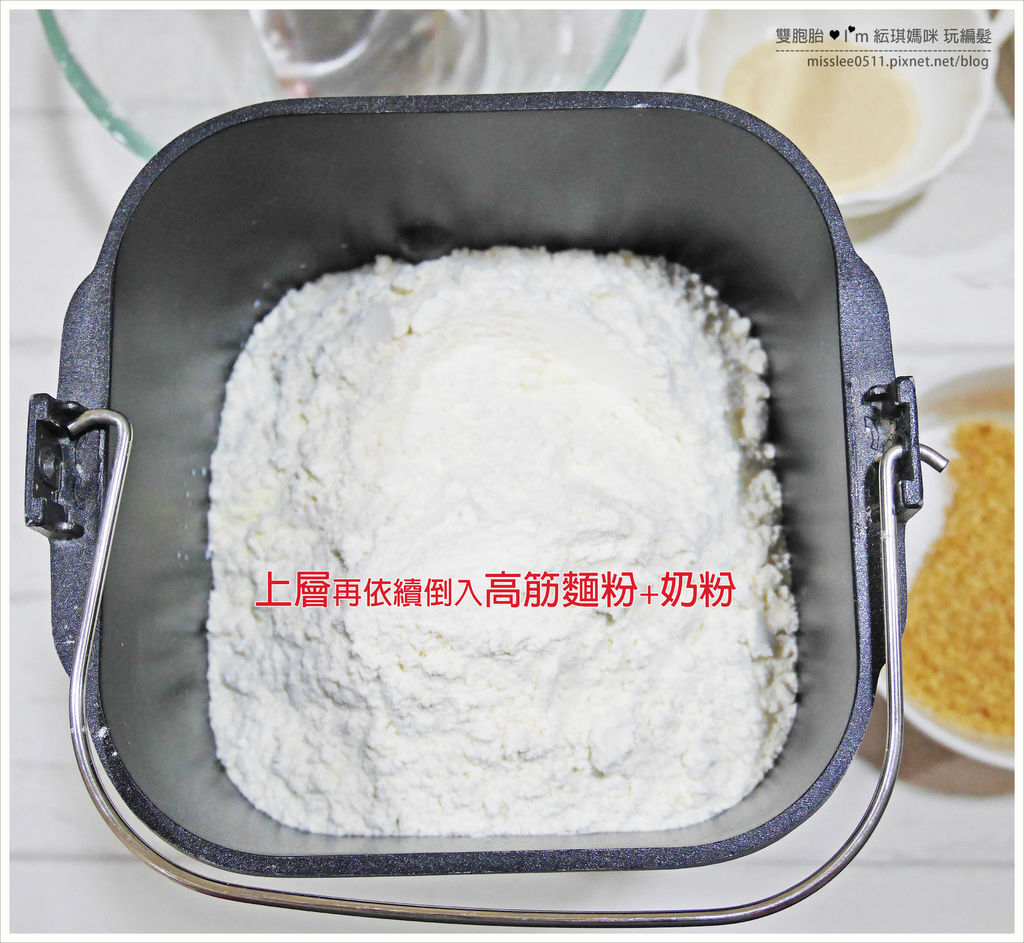液體完成後就是粉類食材了,高筋麵粉、奶粉、糖及鹽。