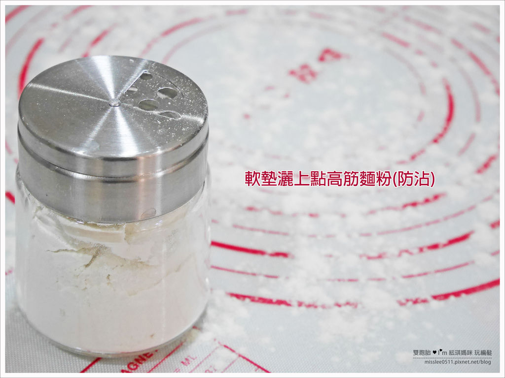 然後將胖五麵包機附贈的烘焙墊準備好,並在烘焙墊上灑點高筋麵粉!