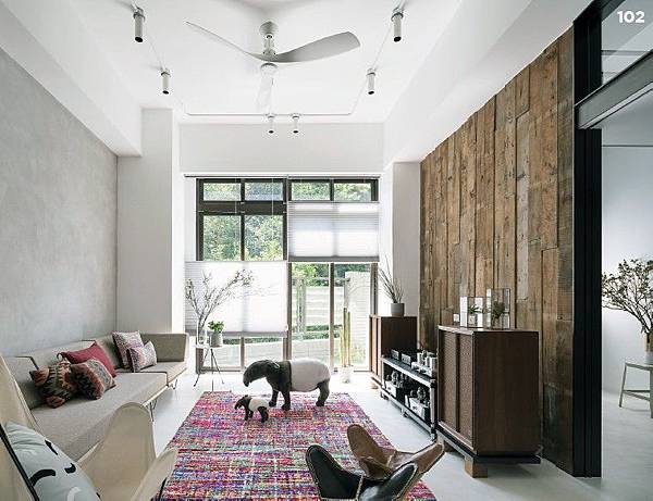 TIPS〉面對平滑的沙發牆與地坪,回收舊木的鮮明紋理,彷彿在家中植了大樹的自然質地。