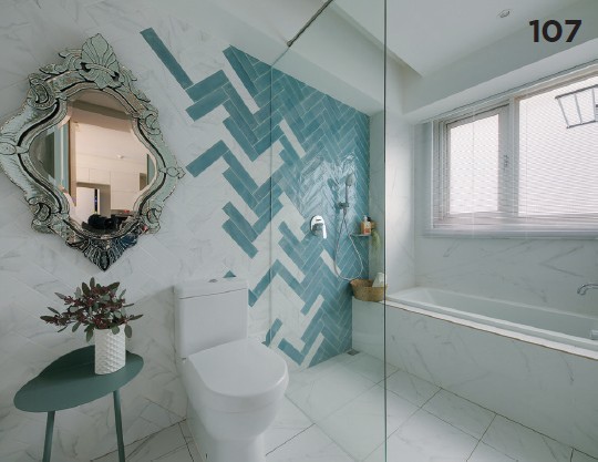 原衛浴空間昏暗狹小,設計師以開窗提升採光,清爽的湖藍色與白色人字形磁磚拼貼,讓空間感顯明亮清爽,而活潑的拼貼形式也創造生動且富有節奏的水波意象。
