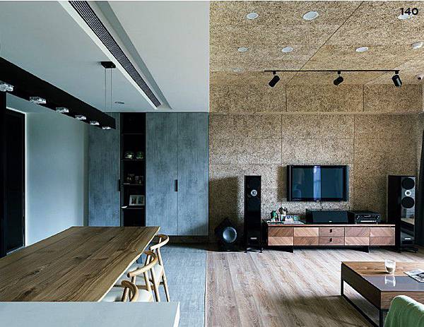 因應男主人鑑賞音樂的興趣,客廳區域採用具有吸音效果的美絲板,並保留材質本身暖色調的特質,與餐廚區域所採用冷色調的克里夫系統板材形成視覺上的溫差,藉由顏色賦予場域性格明確定義,同時也有界定格局的效果。圖片提供© 羽筑空間設計