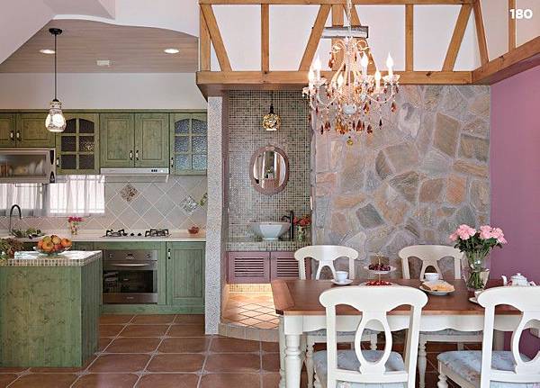 一開始屋主便表示,期望能擁有居住山城小屋的氛圍,於是設計師用各種拼磚形塑自然,先把廚房規劃成綠色,而餐廳則將壁面利用木條裝飾成歐風小屋常見的形式,實踐了屋主夢想中的山城小築。圖片提供© 采荷室內設計