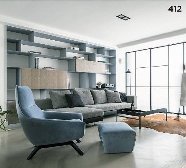 TIPS〉靠背主人椅選用藍色跳脫灰沙發框架,憑藉材質的平衡,削弱色彩對比的銳利,予人眼前一亮的舒適感。