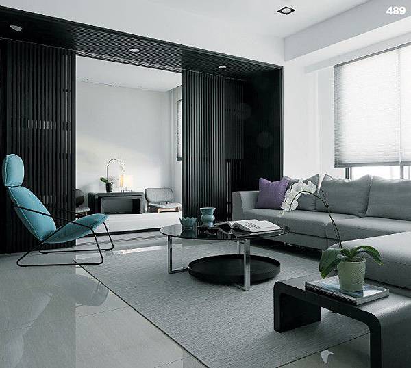 TIPS〉強烈的黑白雙色對比空間,以灰沙發平衡其中,搭上紫色抱枕及醒目的馬卡龍藍躺椅,平滑細緻質地與色調,亦凸顯出現代時尚風範。