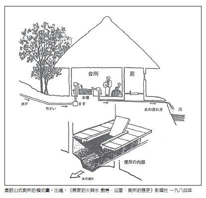 平安時代初期,空海和尚在高野山建廟,山上的寺院或民宅都是用竹筒等,將谷川的水接到廚房或浴池。然後將其排水流到沒有便壺的廁所下方,將排泄的糞便(大便與小便)與水沖至附近的河川裡。根據這份考察,後來便將同樣架構的廁所,稱為「高野山式廁所」。