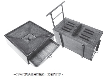 平安時代的貴族住在寢殿式(譯注:日本平安時代的建築式樣之一,中央有主殿[寢殿],四周有複廊和單廊,南側有池塘的豪華宅邸)的住宅裡,寢殿式的建築中沒有特定稱為廁所的設備,一般都使用活動式的馬桶,稱作「樋箱」、「清筥」、「大壺」和「尿筒」。與今日的「便盆」或「尿壺」相當。據考應該是在寬敞大屋中的一角,用類似現在的竹簾圍成一個小隔間,在其中解手。右頁圖中樋箱有個鳥居形狀的部分,一般認為那是解手時,用來擱放太長的和服,以免成為阻礙的工具。後來,這部分便成為蹲式馬桶前面的「金隱」(譯注:即蹲式馬桶突起的遮罩)。而排泄完的糞便,再由傭人拿去外面丟掉。