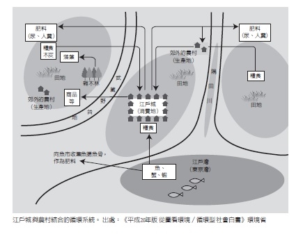到了江戶時代,農村對水肥的利用已普及全國各地,都市與農村藉由水肥與作物(稻米和蔬菜)的結合,形成了「共生循環圈」。