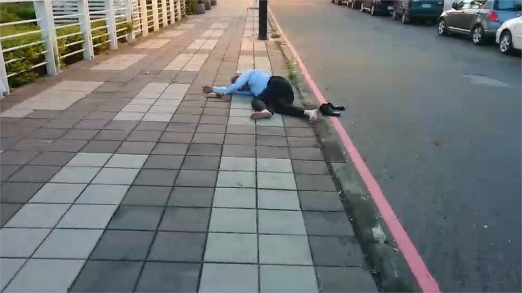 把人行道當成自家床鋪,酒醉路倒的楊姓男子,皮鞋、襪子、眼鏡一脫,就地呼呼大睡,民眾路過第一次看到這種情形,趕緊跟警方報案。