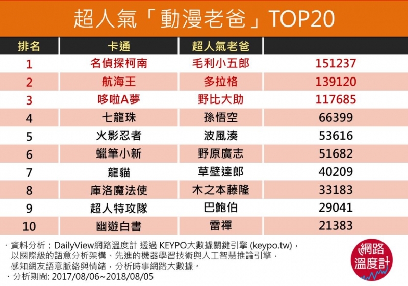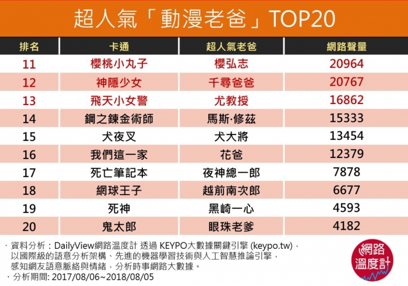 今日DailyView網路溫度計透過《KEYPO大數據關鍵引擎》從2017年8月6日到2018年8月5日間觀察網友在臉書討論、PTT與各新聞媒體、討論區的留言,統整出人氣最高的「動漫老爸」,趕快一起來看看吧!