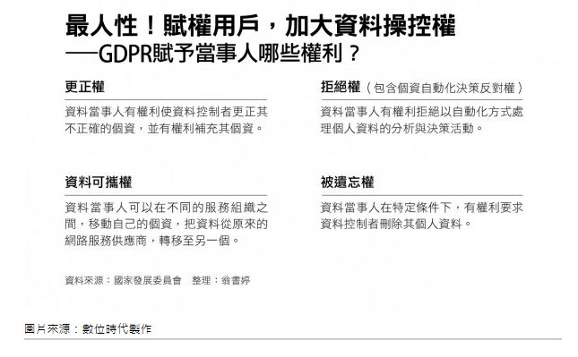 GDPR保障消費者擁有拒絕權、更正權、資料可攜權與被遺忘權。「數據就是石油」的說法已經耳熟能詳,但GDPR法規對於數據的重視,不僅僅如石油而已,更近乎於資本主義運作下的金錢,當我們直接用金錢理解數據的重要性,就更容易理解這個法規背後的意義。