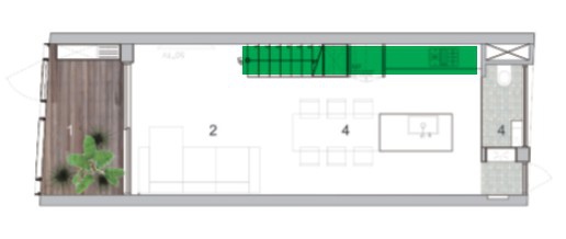 建物周邊無遼闊窗景,改以「向上」、「向內」當作空間感發展方向,並減少隔間,打破既定廳房概念。