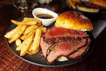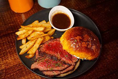 ,就是名廚Leo利用爐烤方式將牛排烤至五分熟後切片堆滿整個漢堡,搭配上焦糖洋蔥與奶香布里歐麵包,