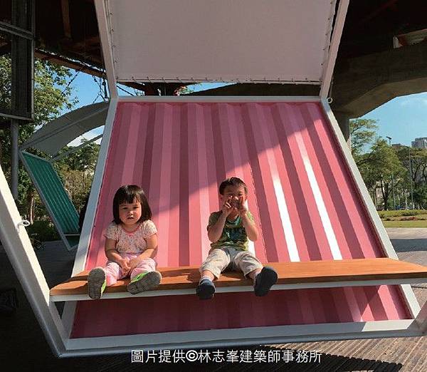 貨櫃的浪板切割,總是可以重新拼裝成驚人的設計。像是林志峯建築師在2 0 1 5年完成的作品「貨櫃鞦韆」,就是切割浪板設計成鞦韆,將鞦韆重新定位為可以一起同樂、甚至可以兩個人一起玩的遊戲。本案特別挑選貨櫃本身的顏色,再以氟碳烤漆增強亮面效果,展現貨櫃繽紛童趣的 一面。