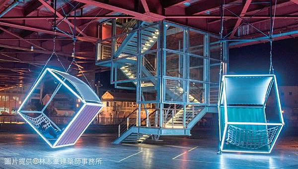以鋼管組成的正方體骨架,並運用LED燈條,讓貨櫃鞦韆在夜裡可以發亮,形成一個獨特的發光體。林志峯建築師在設計貨櫃時,都是運用減法的概念,將貨櫃拆解成面跟線,頂端再增設帆布,讓貨櫃鞦韆可以隨風擺動。