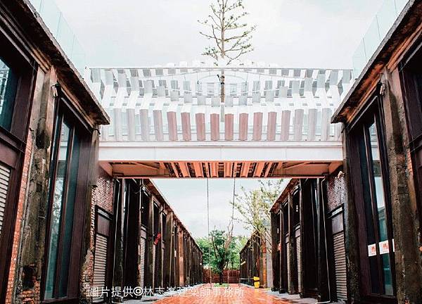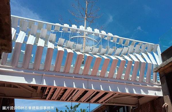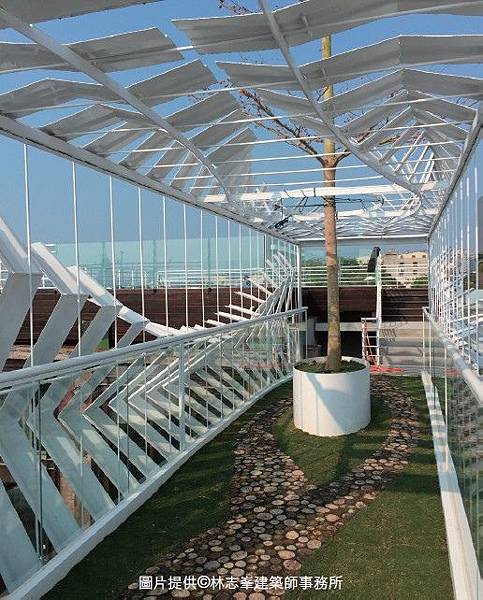 以木作天橋植入草皮走道,與玻璃欄杆作為天橋的主架構,最後再輔以貨櫃浪板成為藝術天橋。在本案例的運用上,貨櫃只是裝飾使用,並沒有結構上的疑慮,但浪板的設計、裁切,還是需要焊接鋼條定位,讓貨櫃浪板不會因時間久了而變形歪斜。