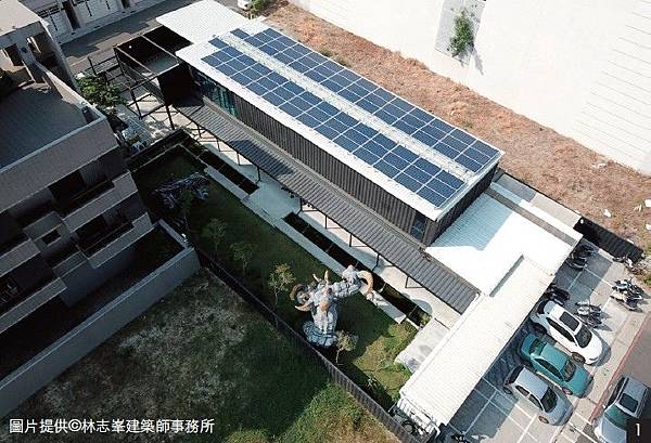 從建築上空俯看,呈L狀的建築造型,可見安裝太陽能發電板的部分,為主要的辦公室區域。另外,較細長的白色貨櫃則是男女廁所空間,將服務空間安置在主體建築周邊的設計,可使辦公空間不再被切割分化,而有完整的場域感。