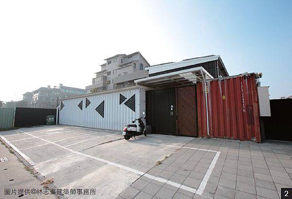 從大門進入的接待區設計半戶外空間,是利用小貨櫃堆疊形成,內有吧檯規劃,配有咖啡機、電視機、冰箱等完整配備,平時也可做為員工的休憩空間、戶外會議室、交誼廳等,具有多功能角色。此區域建築師大量移除貨櫃的側面浪板,只留下角柱做為支撐,在停車場上方刻意留下的骨架造型,暗示貨櫃的無限可能。