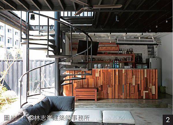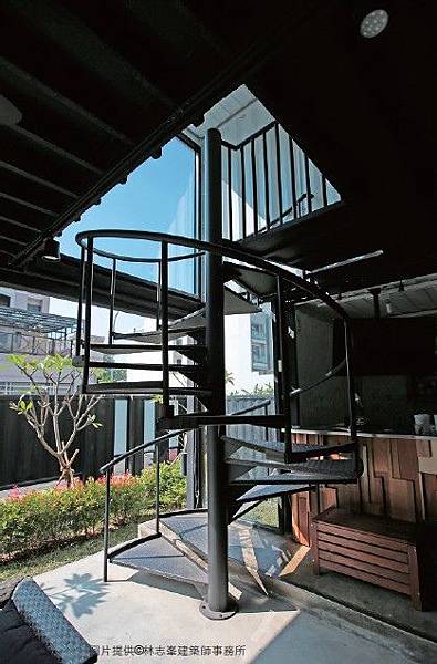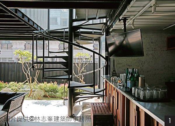 貨櫃底板是木頭材質,裁切加工相當方便,拔掉局部樓地板可做為樓梯間,安裝上一支迴旋梯即可聯絡上下空間。另一個局部挖切的天井,則是植入大樹,並以四周通透的玻璃介面,增加空間採光與造景的趣味性。