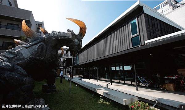 兩年前,三十世代的年輕創辦人因應企業靈活發展,決定使用輕巧的貨櫃來打造企業總部,發揮貨櫃可機動性擴張的特質,使企業總部可以隨著人員編制成長而快速增建。推開酷炫的大門,神秘的黑色建築體降落在草地上,蟄伏在側的是兩尾高達一層樓的巨型獸模型,這場景既魔幻又寫實,彷彿貨櫃屋變成潘朵拉的神秘盒。這座主體辦公室由11個貨櫃組成的132坪場域,十足顛覆了人們對於「辦公室」的既定想像。圖片提供©林志峯建築師事務所