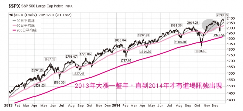 此處的「新高」指的是「52週新高」,而非「歷史新高」。習慣投資台股的朋友對「買創新高」的股票很恐懼,因為常常被騙,最後變成追高殺低、小賺大賠。不過在美股,只要針對的是大型股,「創52周新高」反而是個好的進場標準。原因如前所說,股票市值高就不容易人為操縱,要讓大型股上漲的資金可不小。因此,「創52周新高」很可能代表背後有一股成長動能,這股動能我們散戶不知道、媒體也沒有報,養了一堆研究員的國際級法人們卻可能先一步知道。但股價騙不了人,如果大型法人們認同了這股動能,股價就會被堆高,就有可能創52周新高後一直漲上去,啟動「馬太效應」,進入持續好幾年的正向循環。這樣可能讓您半信半疑,我們來看看101頁這些股價圖。