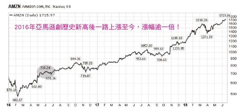 (1)2016年亞馬遜創歷史新高後一路上漲至2018年5月,漲幅逾一倍