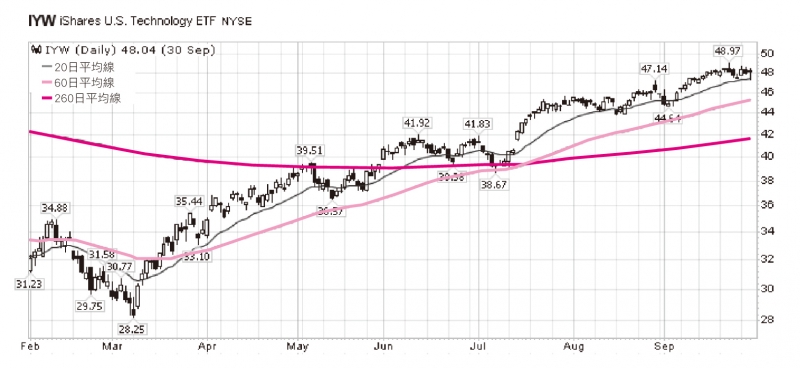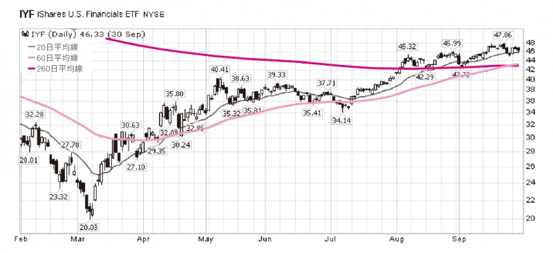 接下來,我們只要知道該產業的ETF代碼,就能憑線圖來判斷該產業強勢與否。產業ETF的大廠有兩家,一家是貝萊德旗下的iShares系列ETF,可以從官方網頁中查詢它們的ETF代碼。或者可以用stockcharts網站配合的”state street ETF”頁面,來找出該產業的ETF。找到產業ETF後,就要來判斷強弱勢了。這邊定義的「強勢」不是漲最多的產業,而是「最抗跌的產業」。比方說,在2009年的9 月中旬時,S&P500從跌破年線的慘況中重返多頭排列,我們啟動了H.A.S.E選股流程。當時,科技股和金融股都在「成交金額排序」中的前幾名,但是兩個產業的線圖卻差了很多。