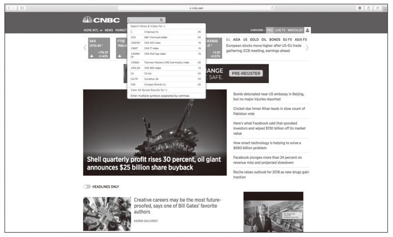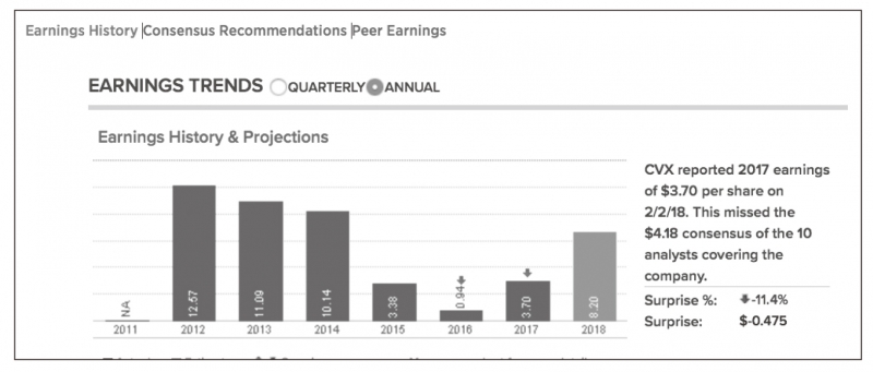 要如何快速地查詢近年EPS呢?我們一樣可以使用CNBC網站。首先,再次回到CNBC的首頁:在此處輸入我們要查詢的股票代碼,比方說雪弗龍(股票代碼:CVX),輸入後進入到公司介紹的頁面,點選「Earnings」,就能看到Earning Trends,也就是近期的EPS。CNBC很貼心的幫我們把近期的EPS畫成柱狀圖,更加一目瞭然。但我們要看的不是「Quarterly(季度)」,而是「Annual(年度)」,因此再點選「Annual」,如此一來顯示的就是近幾年的EPS趨勢了。以雪弗龍來說,它在2012到2016年的EPS逐年下滑,完全沒有享受到經濟好轉的優勢,這就不是我們要的股票。