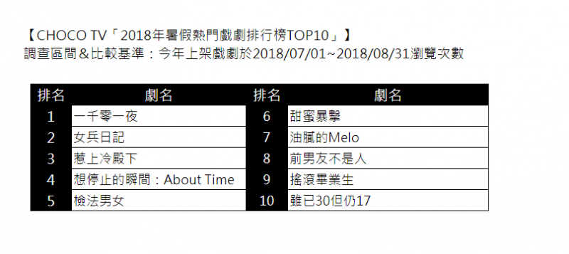 CHOCO TV以優質內容搶佔市場,在今日(4日)公布「2018年暑假熱門戲劇排行榜TOP10」,冠軍由陸劇《一千零一夜》奪得、亞軍和季軍分別是《女兵日記》及《惹上冷殿下》,而分析排行榜TOP10發現,韓劇佔四席,台劇和陸劇分別佔三席,其中又以「愛情」題材最受歡迎;而暑假學生族群觀劇時間增加,暑假期間12~22歲學生族群就佔了整體觀劇人數的近4成,其中,12~17歲觀劇人數更較平日增加5成。